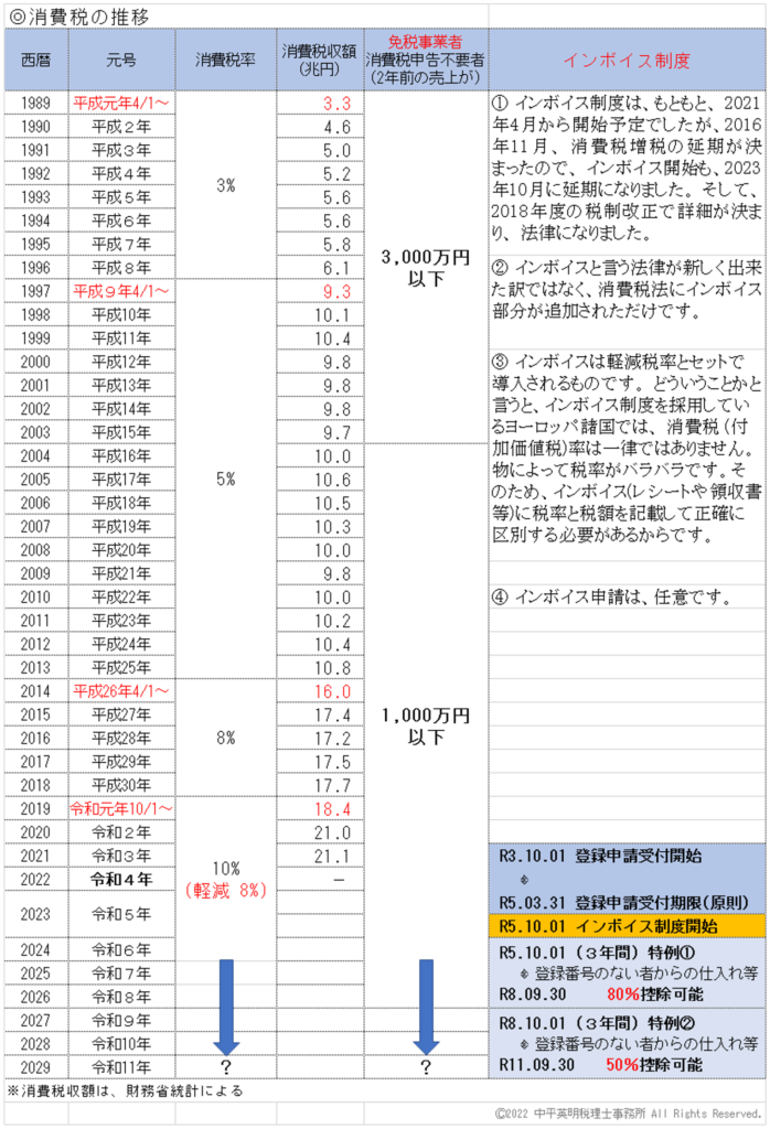 過去の推移を見てみましょう。以下の表は、消費税が導入された平成元年4月から、インボイス制度が導入される令和5年10月までの推移を表したものです。消費税率の増率、免税事業者の売上基準の引き下げ、インボイス導入における免税事業者の課税事業者選択等を想定すれば、消費税の動向が少し、垣間見れます。今後、税率改正、免税基準の廃止が行われば、確実に税収確保が保証される財源になるでしょう。良いか悪いかは別として、所得税、法人税等、他の税目も含めて、インボイス制度は、全体の税負担を考える良い機会だと思います。
