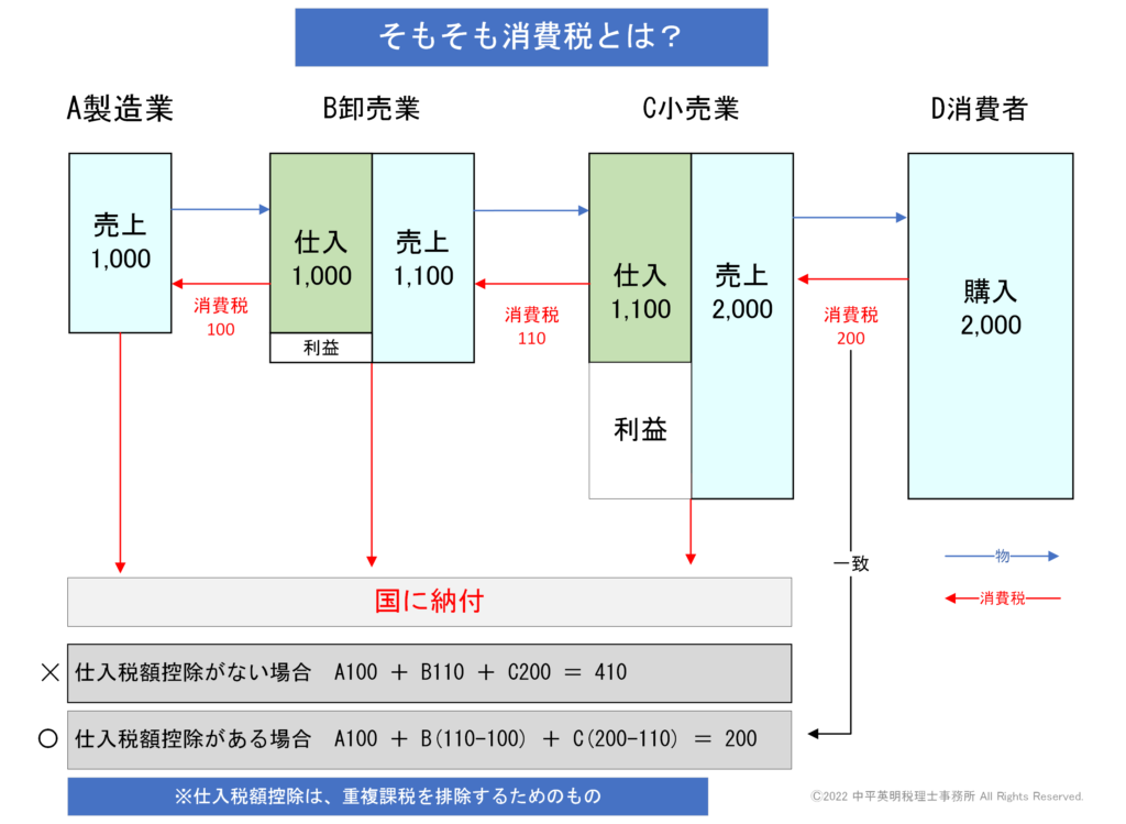 その反面、消費税には、「仕入税額控除」が認められています。これは、取引過程で、それぞれの事業者が消費者から受け取った消費税を、それぞれ納税していたら、重複課税になることを排除するためのものです。